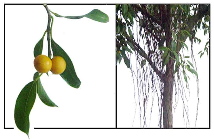 slender aerial roots. Bark is brown and smooth. Leaves are dark green, with a thick waxy outer covering, elliptic,