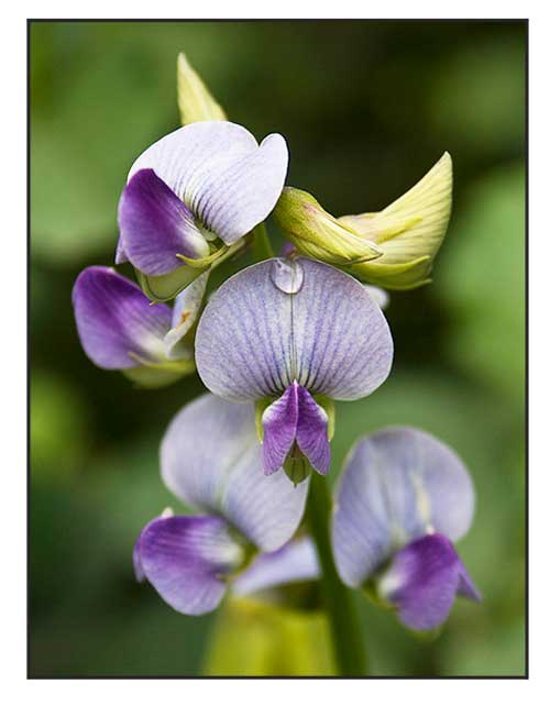 • Annual, subwoody herb, 0.5-1 m tall, with many quadrangular, velvety hairy, yellow branches. Leaves simple, ovate to elliptical, 5-14 cm × 4-9 cm, pubescent; petiole 4-8 mm long; stipules sickle-shaped, 5-20 mm × 4-14 mm, auricled, persistent. Inflorescence a lax raceme, 5-25 cm long, leaf-opposed, with up to 24 flowers; pedicel filiform, up to 5 mm long; bracts linear-acuminate, 4 mm long. Calyx campanulate, 7-11 mm long, hairy, with subequal triangular-acuminate lobes; corolla blue; standard elliptical to suborbicular, 14 mm in diameter; wings ovate-oblong, 13 mm × 6 mm; keel 12 mm × 6 mm, incurved in the middle. Pod oblongoid, 3-5 cm × 0.8-1.2 cm, short stalked, about 16-seeded. Seed heart-shaped, 3 mm in diameter, blackish. (3)