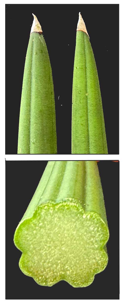 • Growth form: Rhizomatous succulent with rod-like leaves that alternate to form a fan-like shape, growing up to 0.9 - 1.2 m tall and 0.6 - 0.9 m wide. Foliage: Stiff, cylindrical leaves taper to a sharp point and have a ribbed surface (0.6 - 1.5 m long, 2 - 3 cm wide). Leaves are greyish green with indistinct dark green bands that create a striped pattern. Flowers: White, fragrant flowers are tubular with 5 linear lobes curled backwards (2.5 cm long). The long, white stamens extend well beyond the lobes. Flowers are arranged in a whorled pattern along a spike-like inflorescence that is actually a raceme. (Flora & Fauna Web)