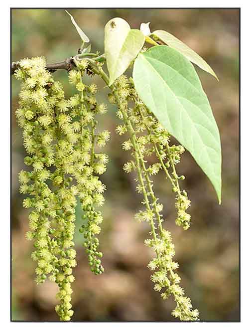 • Trees, up to 25 m tall, deciduous; branchlets tomentose or villous. Stipules lanceolate, ca. 5 mm, deciduous; petiole 5-12 cm; leaf blade ovate or oblong-ovate, 10-15 × 8-14 cm, papery, abaxially villous, adaxially pilose along veins, base cordate, rarely broadly rounded, with 2 or 4 glands, apex acuminate. Male inflorescences 6-25(-30) cm, densely villous; bracts ovate-lanceolate, ca. 3 mm. Female inflorescence 1.5-11 cm, often 1-flowered; peduncle to 3 cm, pilose. Female flowers: pedicel 1-9 mm; calyx 5-6 mm; ovary tomentulose; styles often 3, basally connate, 2-2.5 cm. Drupe globose, 2-4-locular, [1-]2-3.5 cm in diam., glabrous [or hairy]; exocarp thick and fleshy [or very thin]. Fl. Jan-Apr, fr. Jun-Dec. (Flora of China)