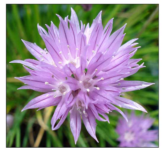 • Chives are a bulb-forming herbaceous perennial plant, growing to 25 centimeters (10 in) tall. Bulbs are slender, conical, 2–3 cm (3⁄4–1+1⁄4 in) long and 1 cm (1⁄2 in) broad, and grow in dense clusters from the roots. Scapes (or stems) are hollow and tubular, up to 50 cm (20 in) long and 2–3 mm (1⁄16–1⁄8 in) across, with a soft texture, although, prior to the emergence of a flower, they may appear stiffer than usual. Grass-like leaves, which are shorter than the scapes, are also hollow and tubular, or terete (round in cross-section). Flowers are pale purple, and star-shaped with six petals, 1–2 cm (1⁄2–3⁄4 in) wide, and produced in a dense inflorescence of 10–30 together; before opening, the inflorescence is surrounded by a papery bract. Seeds are produced in a small, three-valved capsule, maturing in summer. Plant flowers from April to May in the southern parts of its habitat zones and in June in the northern parts. (2)