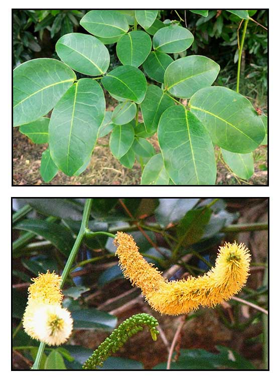 • Gugo is a very large, woody climber (liana). Stems are thick as a man's arm, angled, and much twisted. Bark is dark brown and rough. Leaves are tripinnate, the common petioles usually ending in a long, tough tendril. Pinnae are stalked, usually 4 in number. Leaflets are oblong or obovate, 2.5 to 5 centimeters long, rigidly leathery and smooth. Flowers are 2 to 3 millimeters long, yellowish white, either crowded in long slender spikes from the axils of the upper leaves or arranged in terminal panicles. Pods, few, pendant, 30 to 100 centimeters long and 7 to 10 centimeters wide, somewhat curved, slightly constricted between the seeds. Seeds are hard, and circular, with their sides flattened, about 5 centimeters across, and chocolate brown.