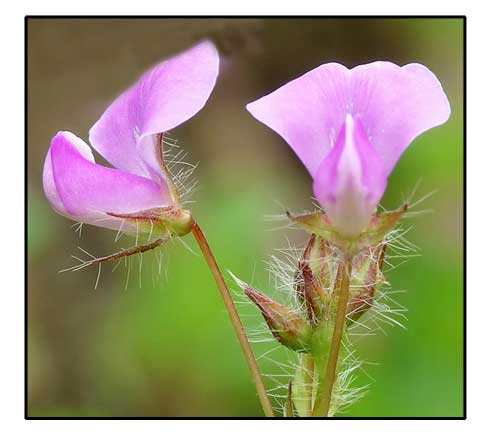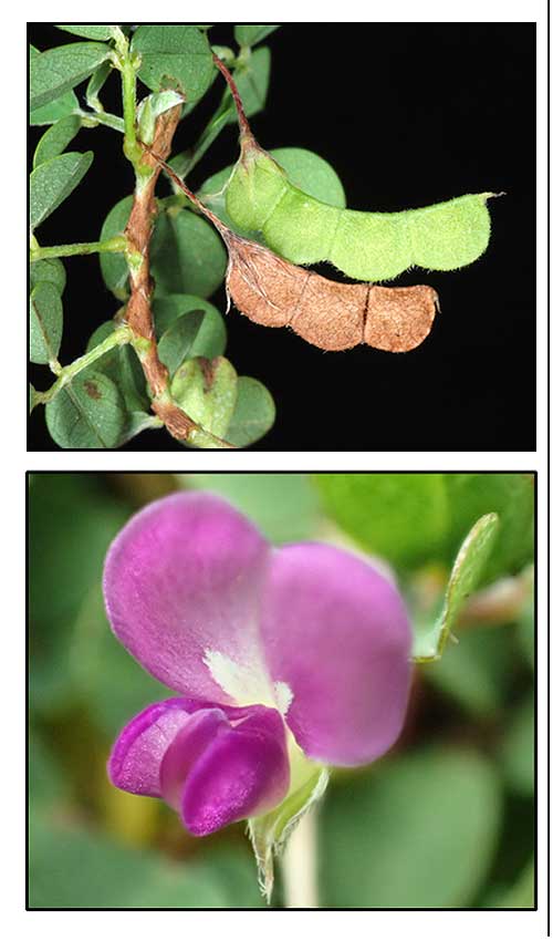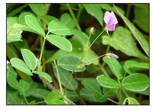 Botany • Growth form: A terrestrial, annual herb that trails along the ground, often up to 50 cm long and rooting at the nodes. Foliage: Stalked, alternate, compound leaves are trifoliate, about 1 cm long. Each heartshaped leaflet is obovate in shape, leaf tip emarginate, with the centre leaflet not more than 0.6 cm long. Flowers: Reddish, pinkish to purplish bisexual flowers are borne singly or up to five on axillary inflorescenes. Fruit: Fruits are slightly curved pods that are hairy, 3-5 jointed, about 1.2-1.3 cm long. (Flora & Fauna Web)