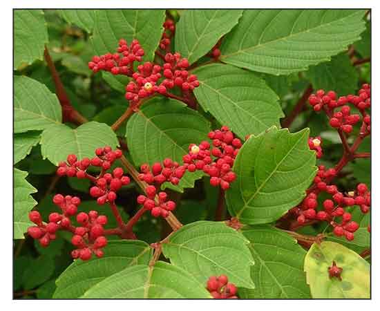 • Growth form: A semi-woody shrub up to 3 m tall. Foliage: Alternate, stalked, 2-4 pinnate leaves are 30-60 cm long, with many leaflets. Flowers: Flowering shoots are compact and 4-16 cm long. Flowers are bright red in color with a yellow central disc. Fruit: Fruits are subglobose berries, turning dark red or purple when ripe, 6-seeded, 7-10 mm wide. (Flora & Fauna Web)