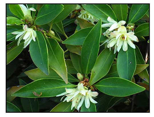• Sanke is an evergreen shrub or small tree growing up to 8 meters high. Leaves are alternate, simple, narrowly ovate or lanced-shaped, 4 to 12 centimeters long, 1.5 to 5 centimeters wide, wedged-shaped at the base, tapering, and blunt at the apex. Flowers are axillary, usually crowded, sometimes solitary, with 12 to 15 perianth lobes, spirally arranged, 3 millimeters wide, pale yellow to white. Carpels are 7 to 9, arranged in a single row or close circle. Fruit is a capsule-like follicetum, 2.5 centimeters in diameter, with an aggregate of 7 to 8 follicles arranged around a central star-shaped axis. Each follicle is boat-shaped and 1-seeded.