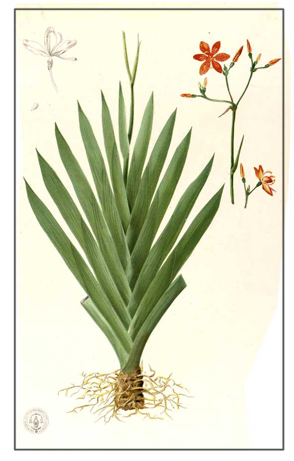 asthma, bronchitis and mumps, blood purification, tumors of the face and breast. B. chinensis is an ingredient in the Chinese product--San Jin Xi Gua Xuang--used for sore throat, mouth and tongue ulcers. Belamcanda chinensis is listed in the Pharmacopoeia of the People's Republic of China.