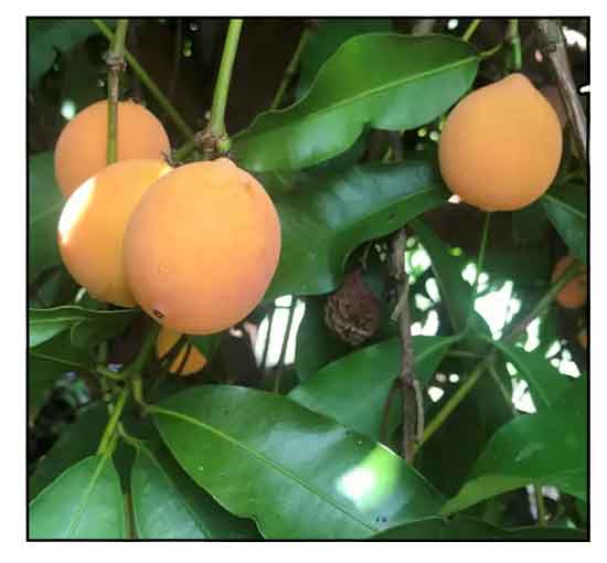 • Achacha is an evergreen shrub or small tree that grows about 6–10 m with pyramidal shaped canopy and stem of 40 cm diameter with a yellowish sap. The plant is found growing in sheltered aspects of woodland, often on limestone, at elevations of 150 – 900 meters and wet forests near the coast of Panama. The plant does best in moist, well drained, alluvial soils rich in organic matter. It is intolerant of saline soils and is moderately drought tolerant. Leaves are opposite, large, glossy dark-green, coriaceous, simple, and elliptic to lanceolate 15–28 cm long and 4–8 cm wide, with entire margin and acute to acuminate apex. Juvenile leaves are pinkish- bronze, turning yellowish-green then to dark green. Flower: Flowers are hermaphrodite, 4-5 white flowers occur on 2 cm long pedicels. Hermaphrodite flowers are 17–36 mm long with, 20–34 stamens, 2 sepals, 4 white, imbricate petals and an ovoid ovary. Male flowers are 9.5–12 mm long, with 26–28 stamens and a vestigial ovary. Fruit: Fertile flowers are followed by smooth ovoid to ellipsoid berry with hard thick skin. The fruit is similar in size and shape to an egg. It is up to 5.5–6 cm long and 4.4–5 cm across at the equatorial diameter and has an average weight of 50 grams. The fruits are bluish-green color when immature to a yellowish-orange and then changes to orange-reddish color as it ripens. Skin is firm and protective, yet quite easy to open. White interior flesh separates easily from the pericarp, containing 1-4 seeds. Seeds are brown, oval, polyembryonic, large 3.0–3.5 cm long and 1.5–2 cm wide surrounded in white acidic sweet pulp. Seeds exude yellow sap when cut. (14)