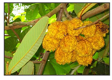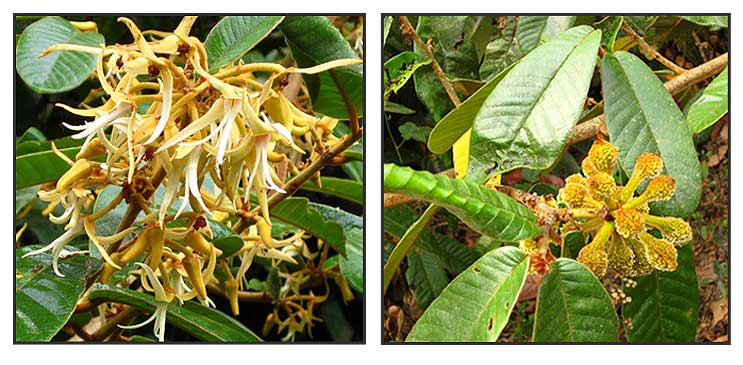 • A large liana can grow up to measure 20 m long. Leaves are oblong, obovate or oblong-lance-shaped and with a size of measuring 8-35 cm x 3.5-15 cm. The rusty brown hairy leaves are with distinct tertiary venation below. The outer orange petals are measure 1-3 cm long. Monocarp is oblong or nearly spherical in shape, measuring about 2-5 cm long and with stalk that up to measure 4 cm long.