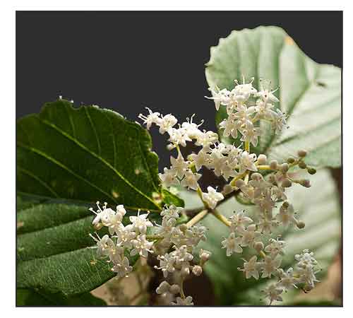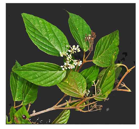 Viburnum luzonicum is a large deciduous shrub or small tree, with a dense mounded habit, growing 3 m tall, feet tall, occasionally reaching 5 m. Bark is light brown. Branchlets are yellow-brown to dark-purplish brown, stellate-pubescent, with dispersed, small, rounded lenticels. Leaves are opposite, stellate pubescent; leaf blade yellowish-green when young, elliptic-ovate to ovate-lanceolate, sometimes subrhombic, 4-9 x 2-5 cm, papery to thickly papery, abaxially sparsely stellate-pubescent or forklike pubescent, adaxially with transparent glandular dots and forklike pubescent on midvein, midvein raised abaxially, lateral veins 5-9-jugaate, pinnate, straight or slightly arched, rarely branched, ending in teeth conspicuously raised abaxially, impressed adaxially. Flowers are white, small, occurring in compound umbel-like cymes, with a drab, slightly unpleasant fragrance. Flowers are followed by fruits. Fruits are ovoid, 5-6 mm, base rounded, apex rounded, glabrous. Fruit a 1-seeded drupe with a ± compressed pyrene, red, purplish, black, or rarely yellow when mature. (1) (2)