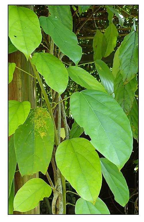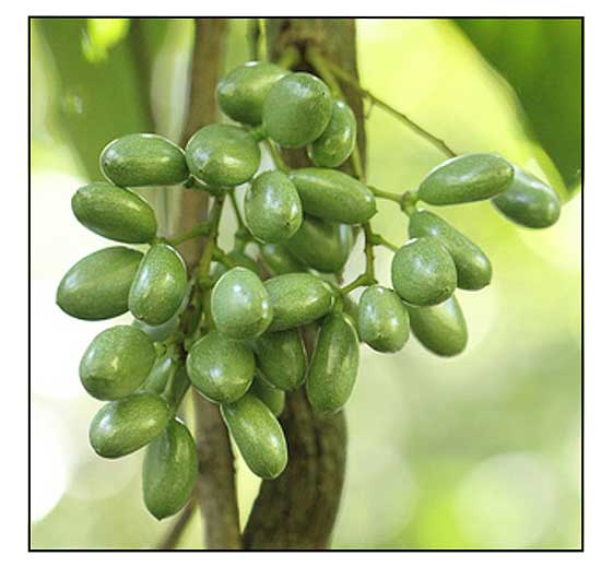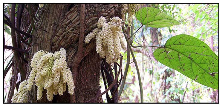 • Large woody climber to 30 m; young stems conspicuously striate, ferrugineous-pubescent at first, later glabrescent. Leaves ovate to broadly ovate or elliptic, base truncate to cordate or obtuse, apex acuminate, 11–25(–29) by 4.5–20 cm, base 3–5-nerved with 2–3(–4) pairs of distal lateral nerves, glabrous above, puberulous to glabrous below, stiffly papyraceous; petioles 6–21 cm. Inflorescences arising several together from protuberances on old stems, racemose, (5–)8–28(–35) cm, usually ferrugineous-tomentose. Male flowers on puberulous pedicels, 2.5–5 mm; outer sepals 3, triangular-ovate to narrowly triangular, 1–2 mm long, lightly puberulous to glabrous; 6 main inner sepals white to yellow, elliptic, 4–5 mm long, reflexed at anthesis, glabrous or externally usually lightly puberulous; petals broadly elliptic, 2.5–3.5 mm long, erect and contiguous at anthesis, concave with lateral edges incurved, glabrous; stamens 2–2.5 mm, anthers either immersed in the thickened connective or rather prominent. Female flowers: sepals and petals as in male; staminodes linear-oblong, acute, 3 mm; carpels curved-ellipsoidal, 2 mm long; stigma shortly multi-lobed. Drupes at first green with white spots, later white to yellow (or orange), containing white latex, radiating from the discoid carpophore terminating pedicels 1–2 cm, drying ± compressed-ellipsoidal, glabrous, base narrowed into a short stalk; endocarp compressed, narrowly to broadly elliptic or subovate in outline, 2–3.5 by 1–2 cm, base rounded to obtuse, apex obtuse to sharply acute, surface obscurely to strongly rugose or rugulose. (e-Flora of Thailand)