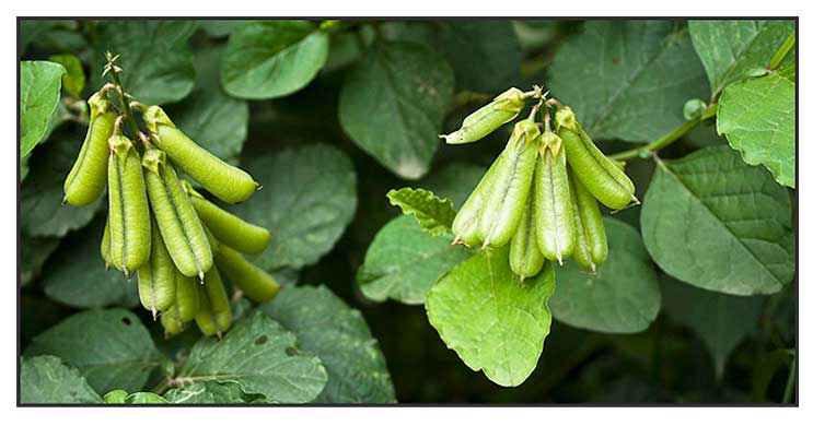 • Annual, subwoody herb, 0.5-1 m tall, with many quadrangular, velvety hairy, yellow branches. Leaves simple, ovate to elliptical, 5-14 cm × 4-9 cm, pubescent; petiole 4-8 mm long; stipules sickle-shaped, 5-20 mm × 4-14 mm, auricled, persistent. Inflorescence a lax raceme, 5-25 cm long, leaf-opposed, with up to 24 flowers; pedicel filiform, up to 5 mm long; bracts linear-acuminate, 4 mm long. Calyx campanulate, 7-11 mm long, hairy, with subequal triangular-acuminate lobes; corolla blue; standard elliptical to suborbicular, 14 mm in diameter; wings ovate-oblong, 13 mm × 6 mm; keel 12 mm × 6 mm, incurved in the middle. Pod oblongoid, 3-5 cm × 0.8-1.2 cm, short stalked, about 16-seeded. Seed heart-shaped, 3 mm in diameter, blackish. (3)