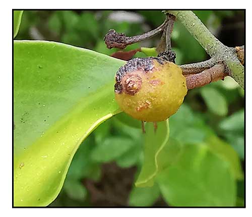 • Growth form: Parasitic shrub, able to grow up to 0.5 - 1 m in length. Foliage: Opposite green leaves, ovate to ovate-oblong, measuring about 2.5 - 6 by 1.5 - 4 cm, both surfaces becoming smooth as leaves mature, leaf margins reddish brown, leaf stalk measuring about 8 - 10 mm long. Flowers: Tubular, curved flowers, usually 2 - 4 in an umbel, peduncle measuring about 2 - 4 mm, stellate hairy, bracts triangular in shape, pedicel measuring about 6 - 7 mm, ovoid calyx, style red in colour. Fruit: Ellipsoid berry yellow in colour, measuring about 8 - 10 by 5 - 6 mm, surface becoming smooth as fruit matures. (Flora & Fauna Web)