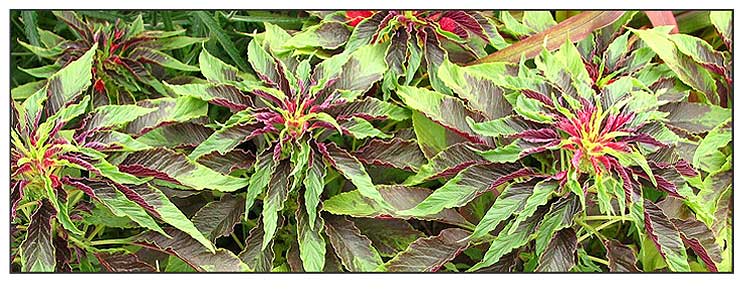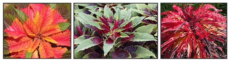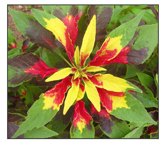 • Plants annual, glabrous. Stems erect, often branched, 0.8-1.5 m. Leaves: petiole 1/2 as long as blade; blade ovate, elliptic, rhombic, or lanceolate, mostly 4-12 × 1.4-6 cm, base tapering, margins entire, usually undulate, apex acuminate and short-mucronate; distal leaf blades green, red, scarlet, maroon, purple, yellow, and cream (unique to A. tricolor). Inflorescences axillary glomerules. Bracts of pistillate flowers ovate to lanceolate, 5-6 mm. Pistillate flowers: tepals 3, narrowly ovate to lanceolate, 5-6 mm, apex aristate; style branches spreading; stigmas 2-3. Staminate flowers intermixed with pistillate; tepals 3; stamens 3. Utricles ovoid, 2-2.5 mm, rugose, dehiscence regularly circumscissile. Seeds black or brownish black, subglobose, 1 mm diameter, shiny. (Flora of North America)