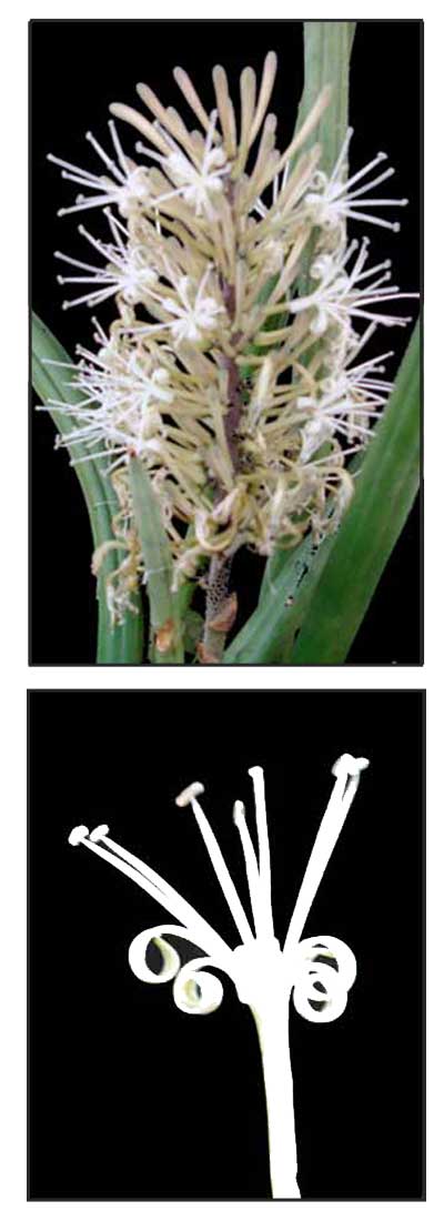 • Growth form: Rhizomatous succulent with rod-like leaves that alternate to form a fan-like shape, growing up to 0.9 - 1.2 m tall and 0.6 - 0.9 m wide. Foliage: Stiff, cylindrical leaves taper to a sharp point and have a ribbed surface (0.6 - 1.5 m long, 2 - 3 cm wide). Leaves are greyish green with indistinct dark green bands that create a striped pattern. Flowers: White, fragrant flowers are tubular with 5 linear lobes curled backwards (2.5 cm long). The long, white stamens extend well beyond the lobes. Flowers are arranged in a whorled pattern along a spike-like inflorescence that is actually a raceme. (Flora & Fauna Web)