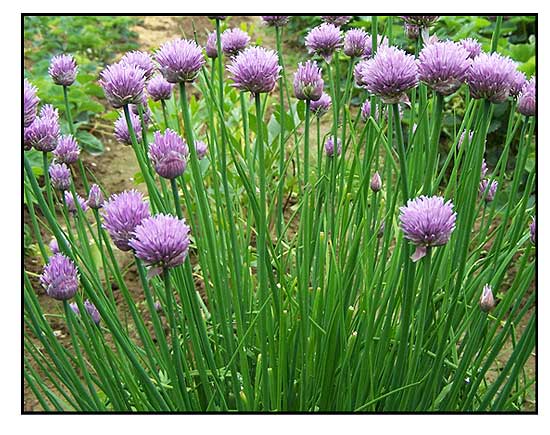 • Chives are a bulb-forming herbaceous perennial plant, growing to 25 centimeters (10 in) tall. Bulbs are slender, conical, 2–3 cm (3⁄4–1+1⁄4 in) long and 1 cm (1⁄2 in) broad, and grow in dense clusters from the roots. Scapes (or stems) are hollow and tubular, up to 50 cm (20 in) long and 2–3 mm (1⁄16–1⁄8 in) across, with a soft texture, although, prior to the emergence of a flower, they may appear stiffer than usual. Grass-like leaves, which are shorter than the scapes, are also hollow and tubular, or terete (round in cross-section). Flowers are pale purple, and star-shaped with six petals, 1–2 cm (1⁄2–3⁄4 in) wide, and produced in a dense inflorescence of 10–30 together; before opening, the inflorescence is surrounded by a papery bract. Seeds are produced in a small, three-valved capsule, maturing in summer. Plant flowers from April to May in the southern parts of its habitat zones and in June in the northern parts. (2)