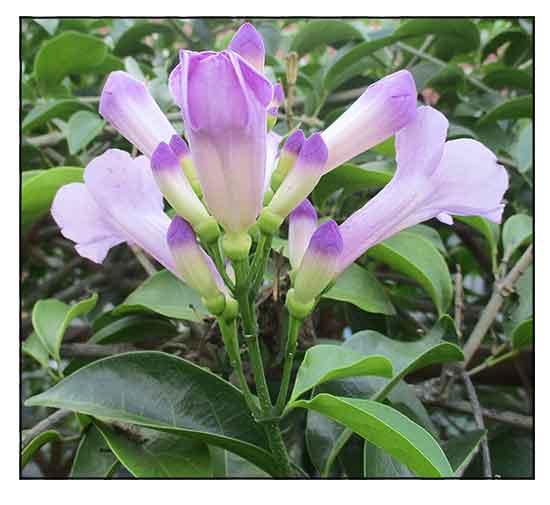 Mansoa alliacea is a shrub or evergreen semi-woody creeper with 2-3 m long stems and young branches with almost quadrangular section. The leaves, on a 0,7-1,5 cm long petiole, are opposite, bifoliate, often with a simple 5-20 cm long tendril between the leaflets. Leaflets on a 0,5-1,2 cm long petiolule, oblong-ovate with obtuse or acuminate apex and entire margin, 10-20 cm long and 3-9 cm broad, coriaceous, with the leaf blades on the sides of the central nervation slightly curved turned upwards and apex curved downwards, of intense green color and glossy above; the rubbed leaves emit a strong smell of garlic. Axillary or terminal panicle inflorescences, on a 0,8-1,5 cm long peduncle, bearing several imbutiform flowers of purple mauve color with white throat, tending pink and almost white with the time passing, 6,5-9 cm long and of 3-5 cm of diameter; the flower emits a delicate smell of garlic that can be felt only when very close to it. Campanulate calyx, 0,5-0,8 cm long, usually truncated at the apex or slightly five-toothed, of green color, corolla with 5-8 cm long tube and 5 roundish lobes, 1-2,5 cm long, and 4 didynamous stamens. The fruit is a flat linear capsule with rounded apex, 10-50 cm long and 1,5-2,4 cm broad; with the two faces crossed in the centreline by a thin crest, containing numerous seeds with two membranaceous wings, 1,8-6 cm long and 1-1,5 cm broad. (17)