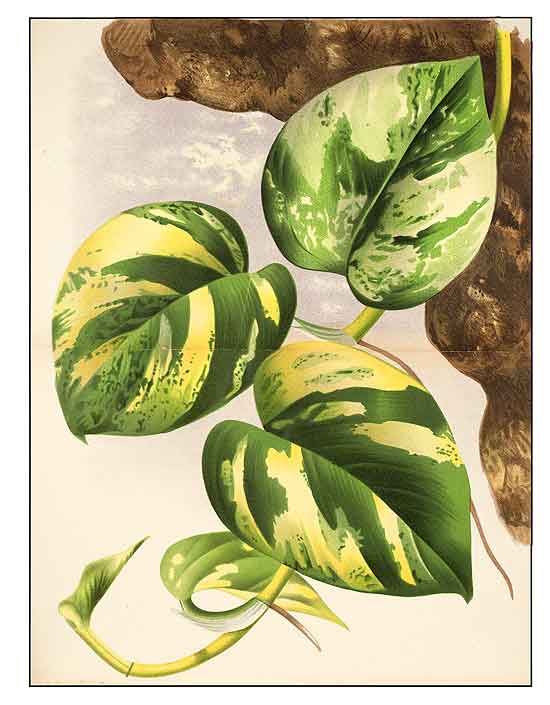 - Etymology: The genus name "Epipremnum" means on-trees, referring to the plant's growth habit. The specific epithet "aureum" means golden-yellow, referring the to foliage color.