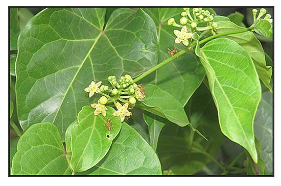 • Climbing herbs, stem glabrous. Leaves 6-10 x 3-5 cm, ovate, apex acute or acuminate, base rounded or subcordate, 5-ribbed, glabrous with a few small black glandular papillae at base, lateral nerves 3 pairs; petiole to 2.5 cm long. Racemes to 2.5 cm long. Flowers 8 mm across, many together; pedicels 1 cm long, slender, pubescent; sepals small, ovate to orbicular, ciliate; corolla greenish-yellow with brown dots, 4 mm long, lobes ovate; gynostegium 2 mm across, outer corona lobes orbicular, emarginate, membranous; inner corona similar to outer. (eFloraofIndia)