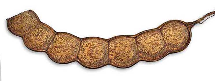 • Gugo is a very large, woody climber (liana). Stems are thick as a man's arm, angled, and much twisted. Bark is dark brown and rough. Leaves are tripinnate, the common petioles usually ending in a long, tough tendril. Pinnae are stalked, usually 4 in number. Leaflets are oblong or obovate, 2.5 to 5 centimeters long, rigidly leathery and smooth. Flowers are 2 to 3 millimeters long, yellowish white, either crowded in long slender spikes from the axils of the upper leaves or arranged in terminal panicles. Pods, few, pendant, 30 to 100 centimeters long and 7 to 10 centimeters wide, somewhat curved, slightly constricted between the seeds. Seeds are hard, and circular, with their sides flattened, about 5 centimeters across, and chocolate brown.