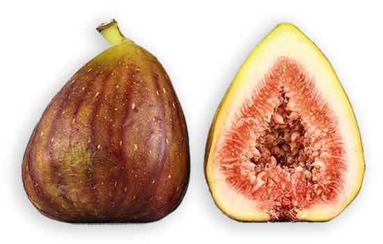 • Ficus carica is a gynodioecious, deciduous much branched small tree or large shrub that grows up to 7-10 m tall. Bark is brown. Leaves are alternate, stipules 1-2 cm long, petiole 6-10 cm long; blade 3- to 5-lobed, broadly ovate, 12-25 cm long and 10-18 cm wide, base cordate, margin serrate, at least near the apex of the lobes. Apex of the lobes acute to acuminate, with scattered stiff hairs above, glabrescent to puberulous below, with 3-5 veins from the leaf base, and about 10 lateral veins in the middle lobe. Fruit develops as a hollow, fleshy structure (synconium) lined internally with numerous unisexual flowers. Tiny flowers bloom inside this cup-like structure. Although called a fruit, the synconium is botanically an infructescence, a type of multiple fruit. Small fig flowers and, later, small single-seeded (true) fruits line the interior surface. The ostiole, a small opening visible on the middle of the fruit, allows passage of the specialized fig wasp, Blastophaga psenes, to enter the inflorescence and pollinate the flowers. At maturity, the "seeds" (single-seeded fruits) line the inside of each fig. The edible mature synconium stem develops into a fleshy false fruit bearing numerous one-seed fruits (druplets). The whole fig fruit is 3-5 cm long, with a green skin that sometimes ripen to purple or brown. A milky sap is produced by laticifer cells, which is thick, sticky, sometimes milky.