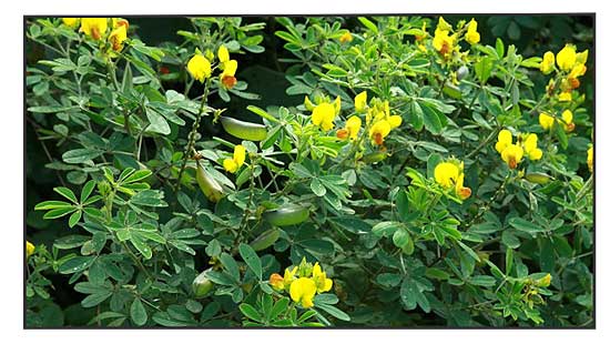 • Kalog-kalog is a half-woody plant growing to a height of 1 meter high. Leaves are alternate, simple, oblanceolate, 6 to 8 centimeters long, 2 to 2.5 centimeters wide, and with rounded ends. Pea flowers are yellow, arranged along a simple terminal flowering stalk (raceme) about 15 centimeters long. Fruits are inflated, smooth, cylindrical pods, 4 centimeters long and 1 centimeter wide, containing several, loose, flattened, black rounded seeds, 3 millimeters in diameter.