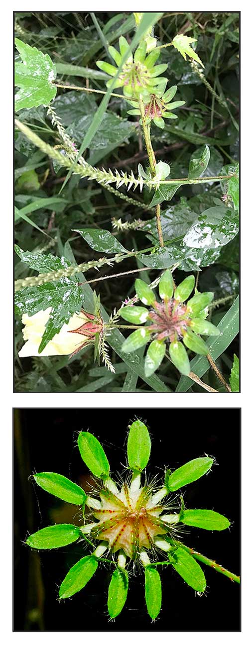 • Bush Sorrel is a weak-stemmed, prostrate or climbing plant covered with soft hairs and scattered prickles. The leaves are rounded, up to 10 X 10 cm, and deeply and palmately 3- to 5-lobed, the lobes being toothed. The flowers are yellow, with a dark center, and occur singly in leaf axils. Petals are obovate, up to 6 cm long and 4 cm wide. This flower can be easily identified by its unique false sepals, which are 8-10 in number. The false sepals (actually bracts) are forked into a spoon-shaped outer part, and a narrow linear inner part. But for this feature, the plant can be confused with Deccan Hemp. The capsules are hairy and ovoid. The seeds are downy. (Flowers of India)