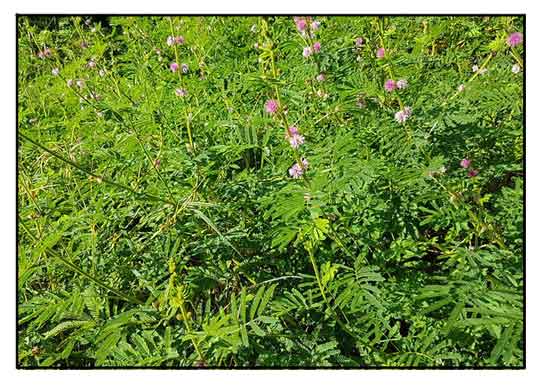 Mimosa diplotricha is a fast-growing, erect shrub and a scrambling climber, which can form dense thickets in a short span of time. It is an annual, although behaves as a perennial. Leaves are bright green, feathery, alternate, each leaf with about 20 pairs of small leaflets, bipinnate, sessile,opposite, lanceolate, acute, 6 - 12 mm long and 1.5 mm wide, sensitive to disturbance. The stem is four-angled, woody at the decumbent base, with re-curved thorns (3 - 6 mm long), up to 3 m in height. The inflorescence is a clustered fluffy ball, about 12 mm across, pale pink, occurs on short stalks (1 cm long) in leaf joints; the corolla is gamopetalous; there are twice as many stamens as petals. The flowering period is from August to February, but can vary from region to region; it flowers throughout the year in some tropical countries. The pods are clustered, 10 - 35 mm long and 6 mm wide, linear, flat, clothed with small prickles, splitting transversely into one-seeded sections at the groves. The seeds are flat, ovate, spiny, 2 - 2.5 mm long and 0.6 - 1.4 mm thick, glossy and light brown. Seed production is in the range of 8,000 - 12,000 per m2. The weight of 1,000 seeds is around 6 gm. Seed setting is from September to February. Roots are profusely branched and with root nodules. (8)