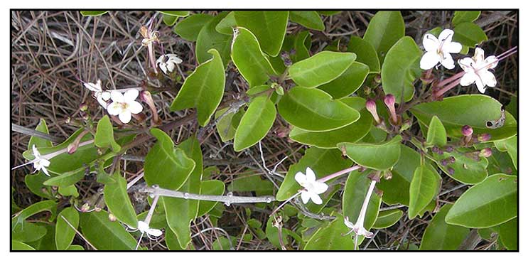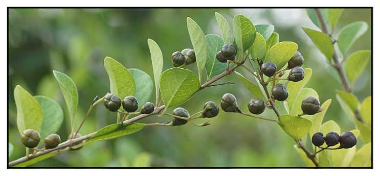 • Growth form: It is an evergreen erect bush that grows up to about 3 m tall, or a climber up to 13 m long. Foliate: Stalked leaves have membranous leaf blades that are oval or narrowly lance-shaped, not covered with hair when mature, and 3.8–8.8 by 1.8–4.3 cm, with inconspicuous veins. Flowers: Flowers grow in groups of 3–7 on the end of branches (axils). Its petals are white or tinged purple, and fragrant. Fruit: Fruit is a drupe, drop-shaped, bright green turning black or brown, and 0.8 cm in diameter. (Flora & Fauna Web)
