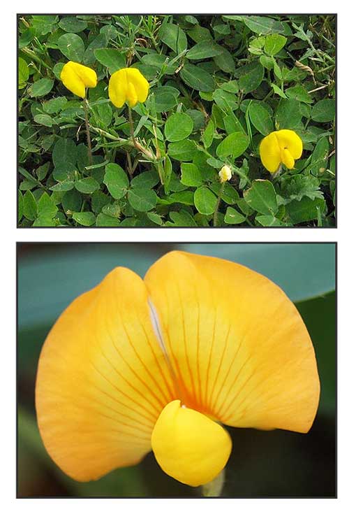 • Growth form: A monoecious annual herb, it has a prostrate to erect growth form and can grow 15 to 70cm high. Roots: It has a taproot, and the lateral roots have nitrogen-fixing nodules. Foliage: The leaves are pinnately compound, with each obovate leaflet measuring 3 - 7cm x 2 - 3cm. The leaflets fold at night in response to the absence of light. This trait allows the plant to conserve water by reducing the area over which water is lost through transpiration at a time when the plant cannot perform photosynthesis any way. Flowers: The stalkless flowers are yellow, butterfly-shaped and are borne on a stalked inflorescence. Fruit: After fertilization, a stalk-like structure or a 'peg' elongates and curves downwards into the soil. Under the soil, the ovary develops into a fruit in the form of a cylindrical pod containing 1 to 6 seeds with constrictions between the seeds. Each seed is covered in a thin, papery seed coat. (Flora & Fauna Web)