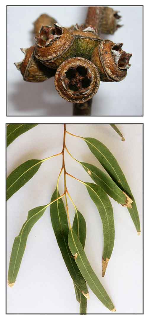 • Eucalyptus tereticornis is a tree that typically grows to a height of 20–50 m (66–164 ft) and forms a lignotuber lignotuber. Trunk is straight, usually unbranched for more than half of the total height of the tree and has a girth of up to 2 m (6 ft 7 in) dbh. Thereafter, limbs are unusually steeply inclined for a Eucalyptus species. The bark is shed in irregular sheets, resulting in a smooth trunk surface colored in patches of white, gray and blue, corresponding to areas that shed their bark at different times. Young plants and coppice regrowth have dull bluish green, egg-shaped leaves that are 60–130 mm (2.4–5.1 in) long and 30–80 mm (1.2–3.1 in) wide. Adult leaves are the same shade of green on both sides, lance-shaped to curved, 80–220 mm (3.1–8.7 in) long and 10–35 mm (0.39–1.38 in) wide, tapering at the base to a petiole 13–30 mm (0.51–1.18 in) long. Flower buds are arranged in leaf axils in groups of seven, nine or eleven on an unbranched peduncle 7–25 mm (0.28–0.98 in) long, the individual buds on pedicels 2–6 mm (0.079–0.236 in) long. Mature buds are an elongated oval shape, 9–16 mm (0.35–0.63 in) long and 3–6 mm (0.12–0.24 in) wide with a conical to horn-shaped operculum that is much longer than the floral cup. Flowering has been recorded in most months and the flowers are white. Fruit is a woody, hemispherical capsule 2–6 mm (0.079–0.236 in) long and 4–8 mm (0.16–0.31 in) wide with the valves prominently protruding. (23)