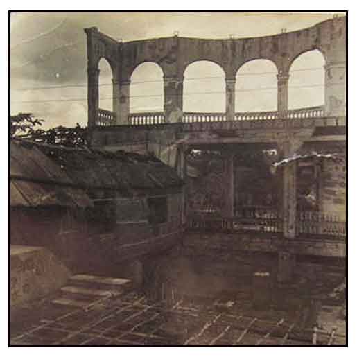 When the American came to liberate the town, the house was strafed. The bombing totally destroyed the middle part of the stone house. Further damage was added by torching done by the Makapilis. What remained of the original Mapua structure was the Elias and Crocodile garden sculpture, the two-story veranda in front, and the four-story portion in the rear. The intact front and rear portions were connected by temporary shelters--barong-barongs made of bamboo, roofed by salvaged GI sheets.