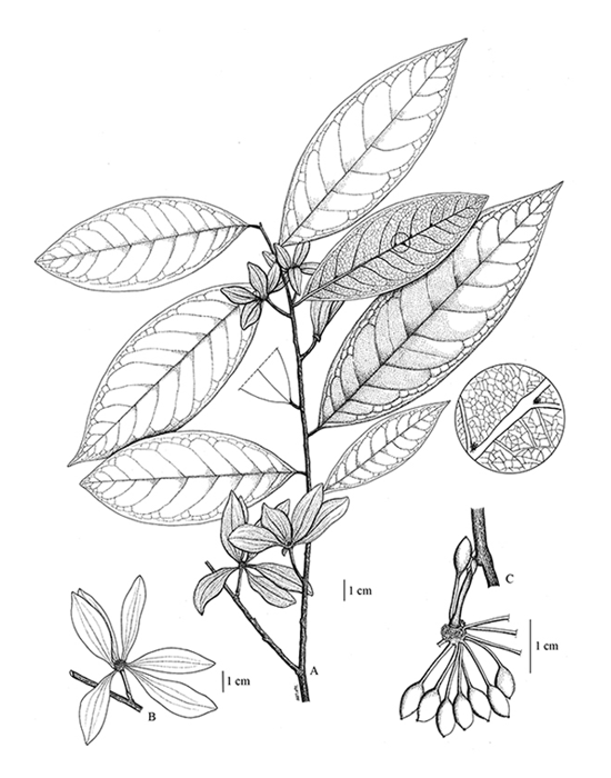 • Tree to 10 m tall. Twigs appressed-puberulous. Leaves subcoriaceous, elliptic, 12.3–17 by 4.1–5.5 cm, base cuneate, apex acute to acuminate, glabrous on both sides, secondary veins 10–13 per side, distinct below, hairy domatia generally present at axils of secondary veins below. Inflorescences 1-flowered, pedicels 14–22 mm long, each bearing 1–2 bracts at or near the base. Sepals free, ovate-triangular, 2.5–3 mm long, apex acute. Petals yellow, ± subcoriaceous, erect at anthesis; outer petals elliptic, 32–50 by 10–16 mm, apex obtuse; inner petals elliptic, 32–47 by 12–19 mm, apex obtuse. Stamens numerous, 1.2–1.8 mm long, anther connective apex truncate. Carpels numerous, ovaries appressed-villous, stigmas ± ellipsoid. Receptacle ± conical. Fruit of up to 38 monocarps borne on a pedicel up to 25 mm long. Monocarps ellipsoid(-cylindrical), 1–1.2 by 0.5–0.65 cm, apex usually short-apiculate, base contracted into a stipe 13–18 mm long. Seed 1, ellipsoid to ellipsoid-cylindrical, 9–11 by 4–5.5 mm. (eFlora of Thailand)
