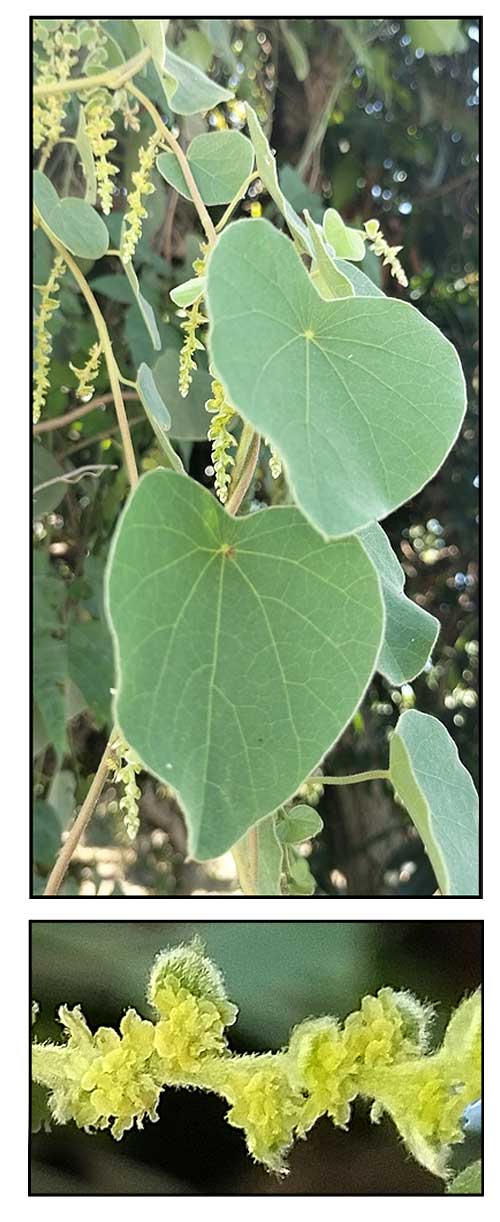 • It is a slender tomentose climber. The leaves are peltate, 2.5–12 cm long, 2.5–11.5 cm broad, triangularly broad-ovate, or orbicular, obtuse, mucronate, base cordate or truncate, ± tomentose on both sides; petiole pubescent. Flowers are small in size, pedicels filiform. Male flowers clustered in the axil of a small leaf; sepals are 4 in number, obovate-oblong, hairy outside; petals 4 in number, united to form a 4-toothed cup, hairy outside; stamens 4, column short, anthers connate, encircling the top of the column. Female flowers clustered in the axils of orbicular, hoary imbricate bracts, on 5–10 cm long racemes; sepal 1, petal 1; carpel 1, densely hairy; style shortly 3-fid. Drupe 4–6 mm long, 3–4 mm broad, subglobose, compressed, hairy-pubescent, red when fresh, black when dry, endocarp transversely ribbed, tuberculate. Seeds are horseshoe-shaped. (52)