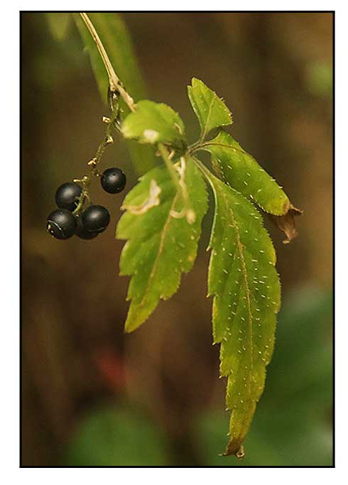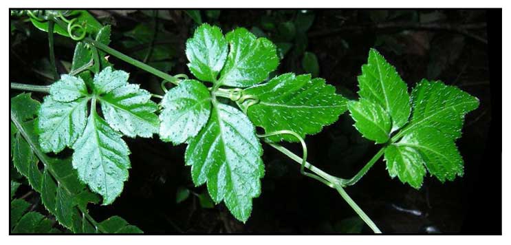 • Growth form: Herbaceous climber that grow to 8 m. Foliage: Leaves are compound, usually 5–7-foliolate, sometimes 3–9-foliolate. Both upper and lower surfaces are covered with coarse stiff hairs (hispid). Tendrils are very slender (filiform) and forked into two. Stems:Stem is slender, cylindrical and stout. Mostly glabrous or sparsely hairy, stem is beset with fine longitudinal lines or grooves. Flowers: Flower is greenish white with 5 deep lobes. Flowers are borne in the form of panicle, where female flowers have shorter panicle than male flowers. Female and male flowers are found on separate plants. Fruit: Fruit is indehiscent and black when matured. Densely hairy fruit is globose, about 5 – 6 mm wide. Fruit contains 2 brown seeds. Seeds are papillose and ovate-cordate, about 4 mm wide. (Flora & Fauna Web)