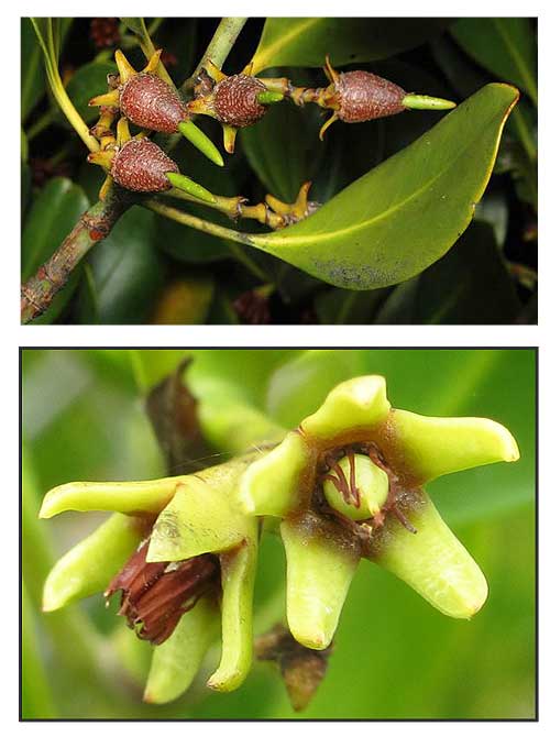 • Growth form: Small to medium-sized tree, growing up to 20 m approx. In Singapore, trees tend to be 10 m or less. Trunk: Smooth bark, sometimes fissured, grayish brown in color, flanged stem base. Roots: Short buttress roots forming from short stilt roots originating from the base of a mature trunk. Foliage: Rounded, glossy-green leaves 5.5 - 10 by 2 - 3.5 cm, obovate-elliptic and often having an inwardly-curled margin. Flowers: 5 - 10 flowered, pendulous flower head measuring 2 by 10 - 20. It has a long, slender stalk, is resinous and occurs at the ends of new shoots or in the axils on older ones. Calyx lobes are erect in flower, recurved in fruit, 4 - 5 mm in length, with a 2 mm long tube. Stamens have long, slender filaments that extend far beyond the blunt anthers. Fresh flowers are white in color and they turn brown quickly. Flowers emit a faint fragrance which attracts moths and bees. Fruit: Inverted hypocotyl with angular ridges, slender and measuring 4 - 25 cm in length. Characteristic white collar below the calyx. (It is the only mangrove species with flattened terminal buds)